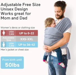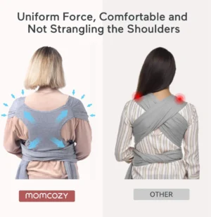 - Momcozy baby wrap carrier is designed with adjustable size, the size can be covered to XXS-XXL to suit different groups of people. The baby wrap allows you not to worry about postpartum body changes and other issues, and can adjust the appropriate size at any time according to your and your baby’s body shape, suitable for the whole family to use. Traditional baby carriers loosen during use, but the adjustable size design keeps your baby supported and balanced in your arms.