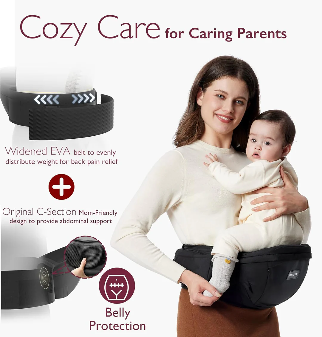 Innovative 3D Abdominal & Lumbar Support – EVA massage pad reduces abdominal pressure, while the widened belt evenly distributes baby’s weight for better back and shoulder support.