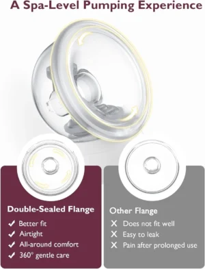 - New concept of the double-sealed flange made from suction-sealed materials makes spills a thing of the past. It is designed to give moms that “barely-there” all-around comfort fit, and a spa-level pumping experience.